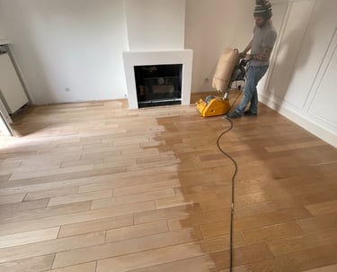 Ponçage en profondeur, suppression des anciennes finitions et préparation minutieuse du support.