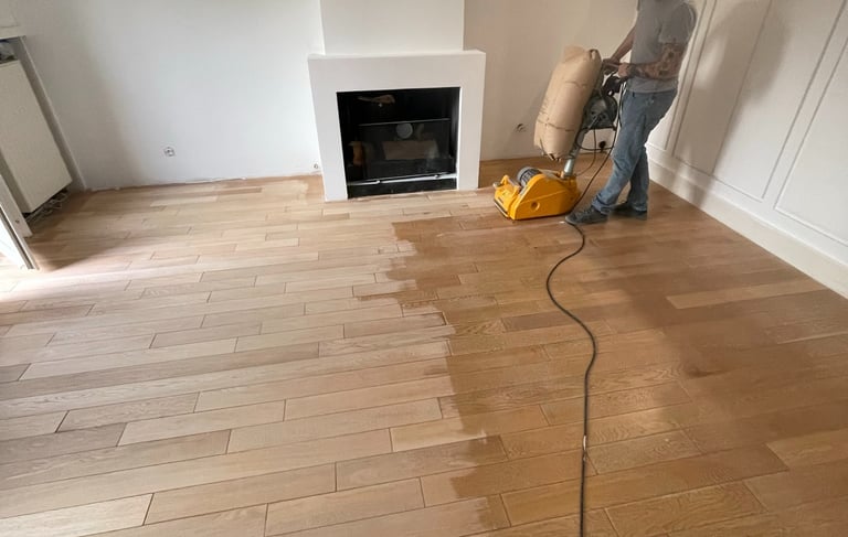 Pose de parquet massif collé pour une stabilité durable et un rendu authentique.